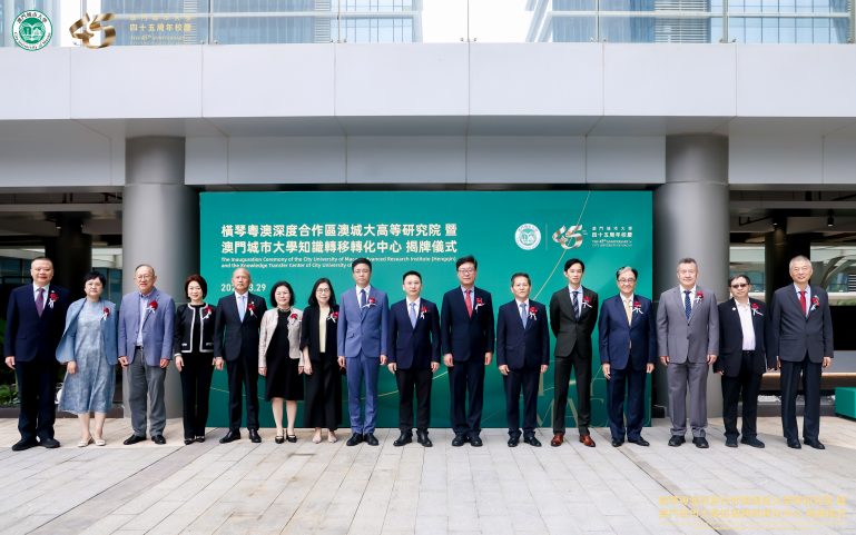 中國工程院院士方濱興,中國科學院院士管曉宏,英國皇家醫學院院士何月蓉,中央人民政府駐澳門特別行政區聯絡辦公室教育和青年部副部長李勇先,廣東省委橫琴工委委員、合作區執委會副主任李翀,廣東省委橫琴工委二級巡視員、合作區經濟發展局局長吳創偉,澳門經濟及科技發展局代局長鄭曉敏,澳門科技基金委員會委員鄭冠偉,橫琴粵澳深度合作區民生事務局副局長許鳳梅,澳門教育及青年發展局高等教育廳廳長許嘉路,澳城大校監、校董會主席陳明金,校董會副主席吳在權,校董李佳鳴,校長劉駿出席主禮揭牌儀式。儀式開始前,主禮嘉賓參觀橫琴澳城大高研院及知識轉移轉化中心的科創環境和相關實驗室。